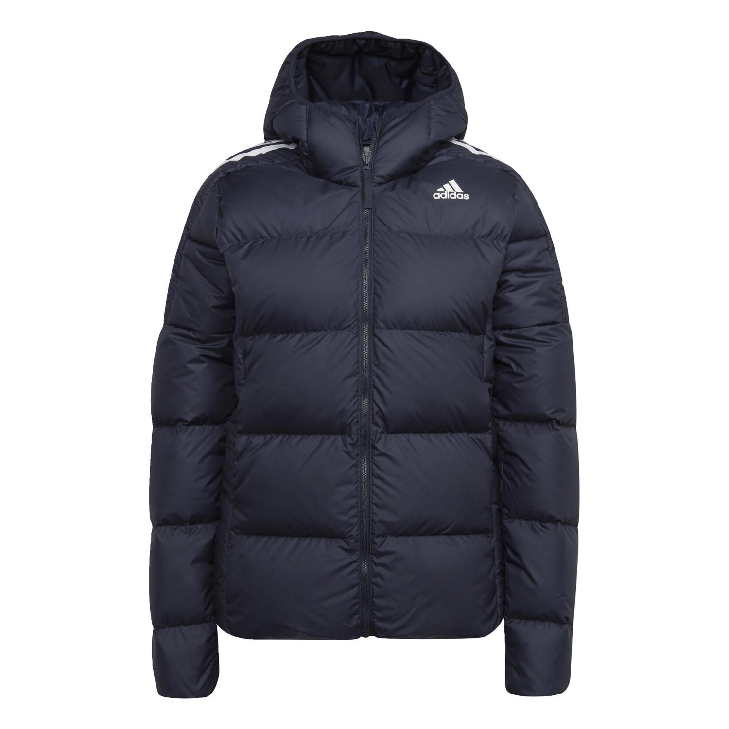 Cold commutes. Winter adventures. This adidas down jacket seals in heat to keep you focused on the moment. Down-filled baffles offer all-natural warmth and a lightweight feel that seals in heat. The shell sheds light rain and snow to keep you dry through light showers.This product is made with Primegreen, a series of high-performance recycled materials.