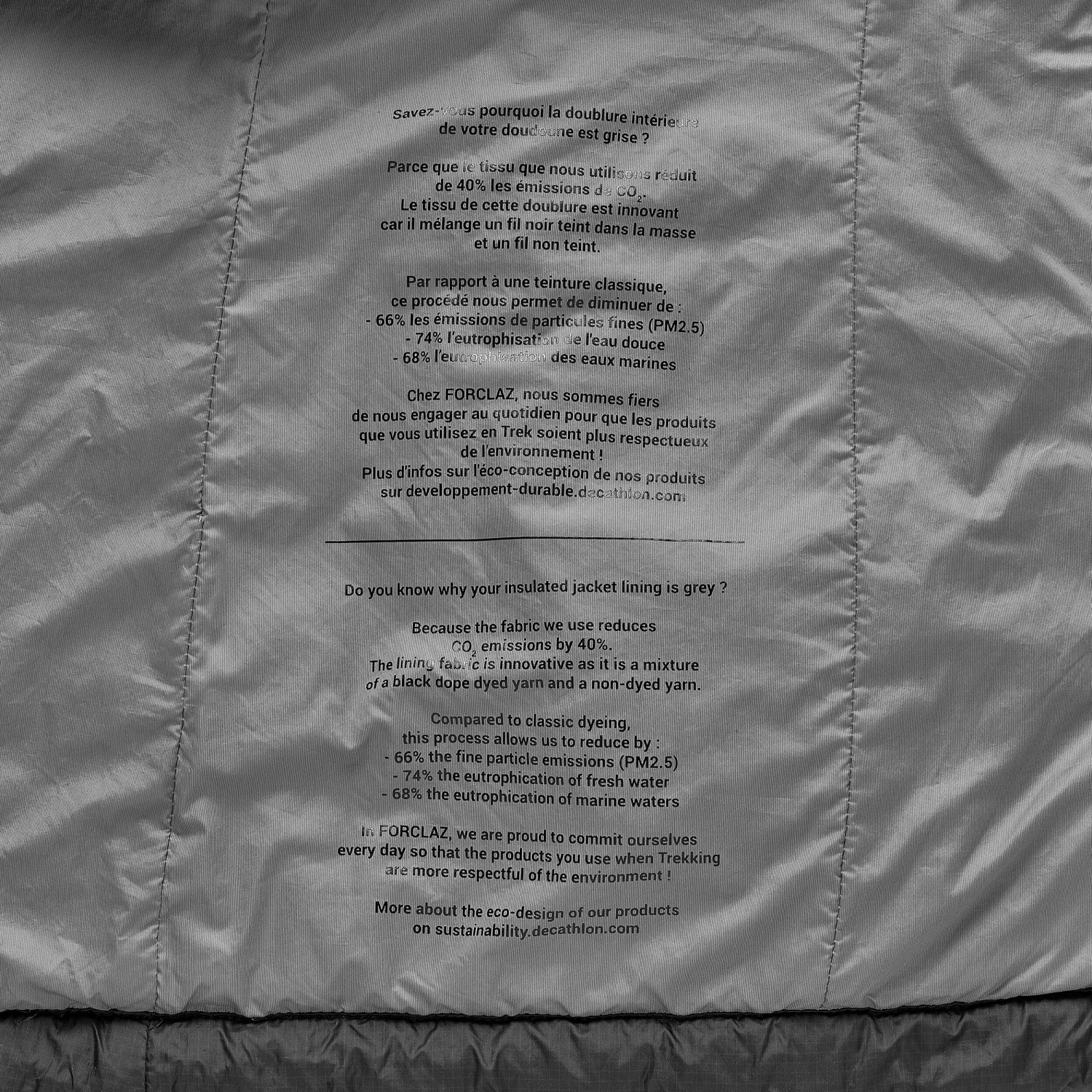 We use 100% polyester wadding (100% recycled) weighing 125 g/m2 in the body and 100 g/m2 in the sleeves and hood.