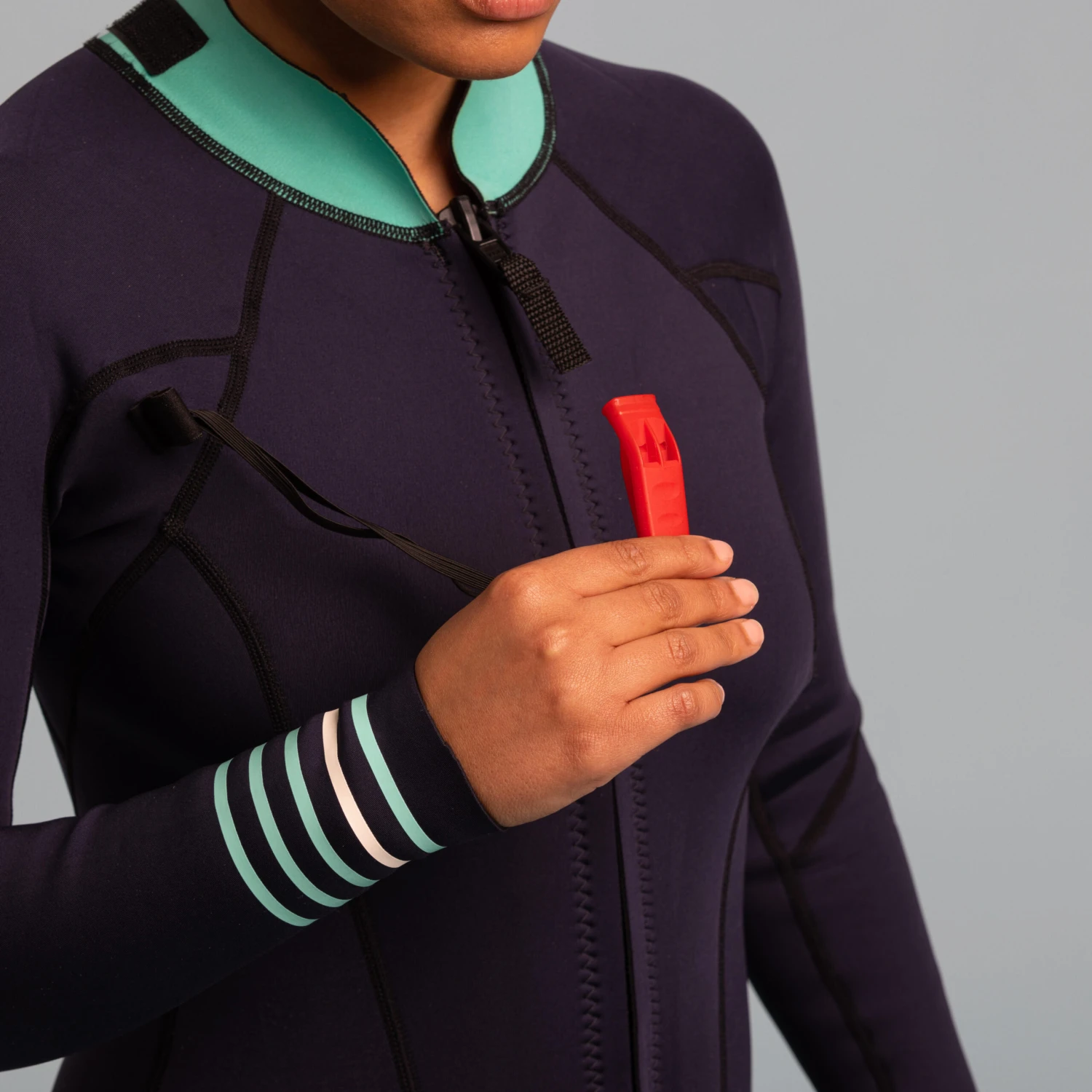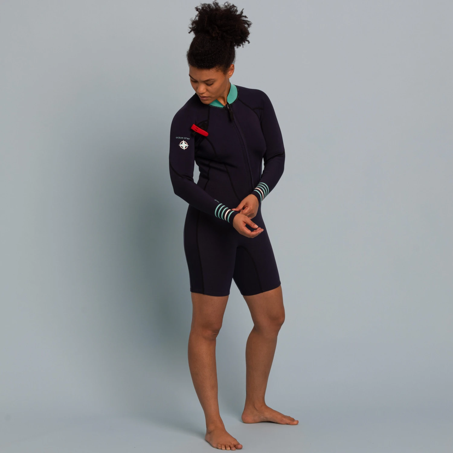 Long-sleeved neoprene shorty wetsuit (2/2 mm) for women who enjoy sea-walking and who want to stay warn in waters between 18 °C and 24 °C.100% Superstretch neoprene construction makes it extremely flexible and comfortable.The double zip opening system at the front and back makes it quicker to put on.