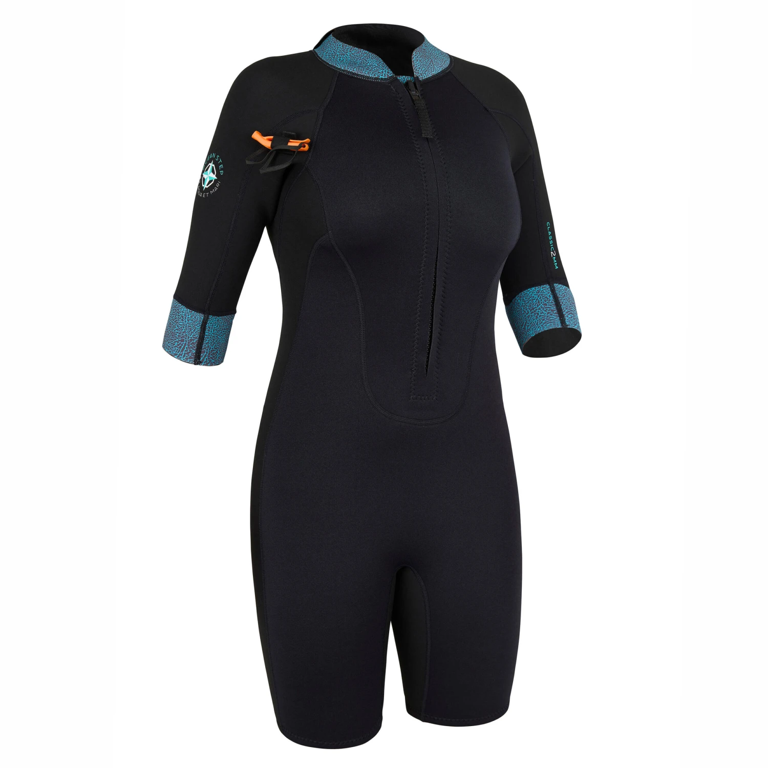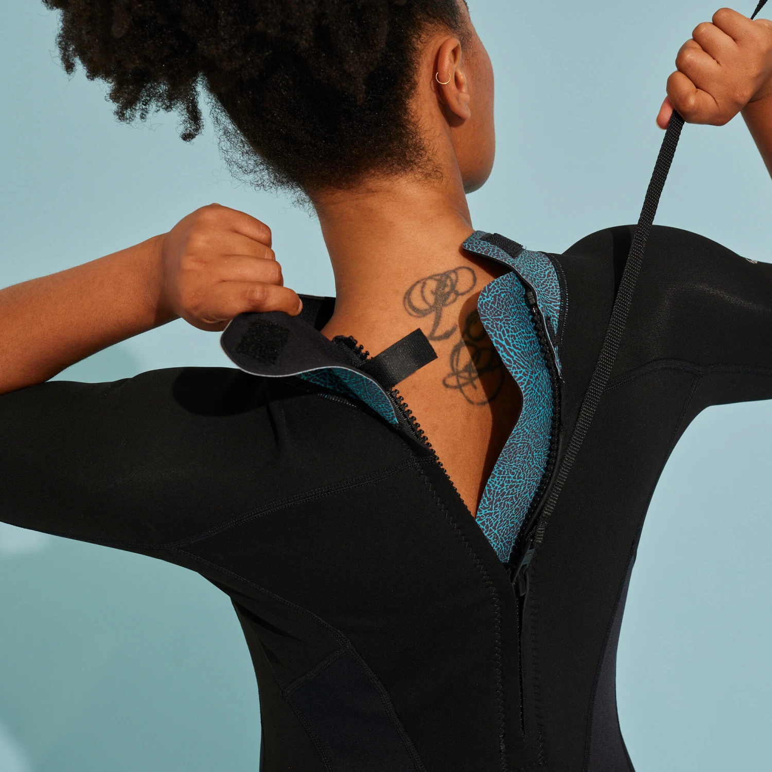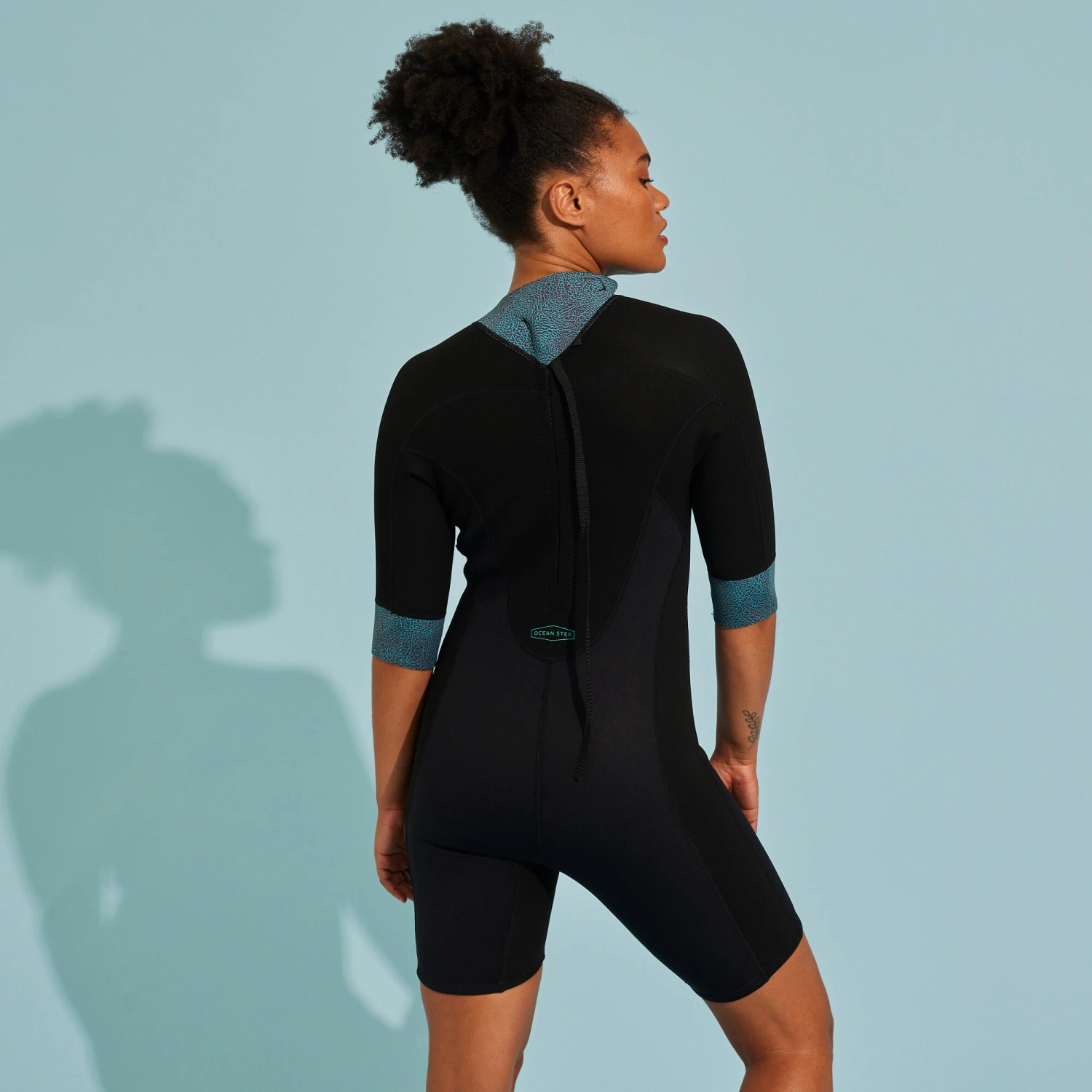 Neoprene shorty 2/2 for women who enjoy sea walking and who are looking for thermal comfort for their upper body in waters between 18 and 24 °C.Tired of struggling to put on your shorty? Thanks to its double zip and its stretchy neoprene, this shorty will provide you with quick and easy putting on motion.
