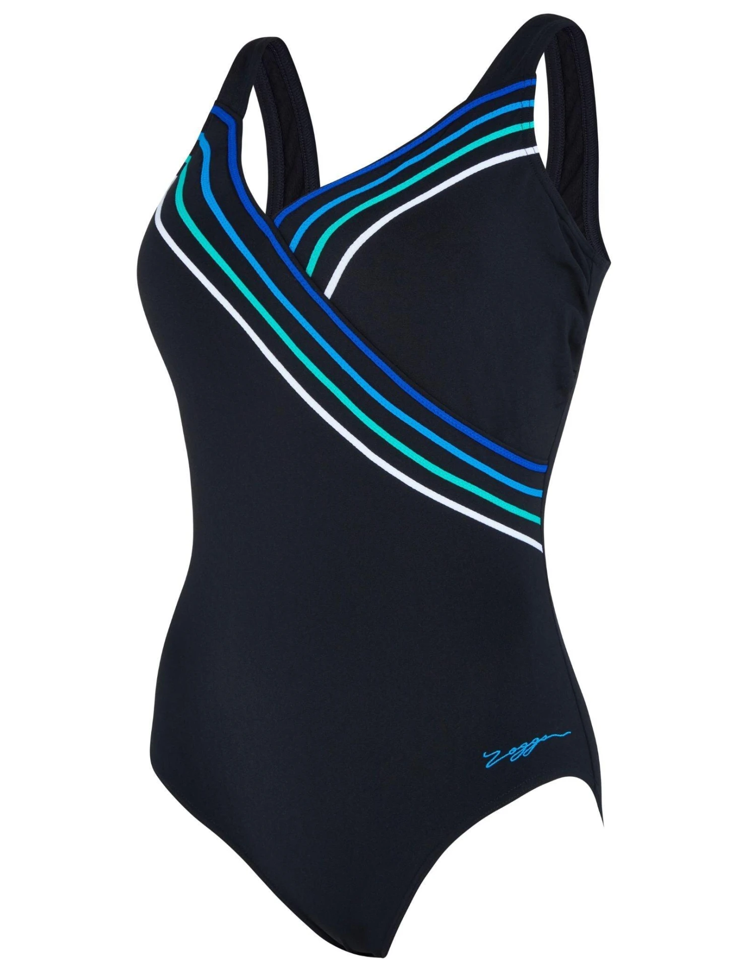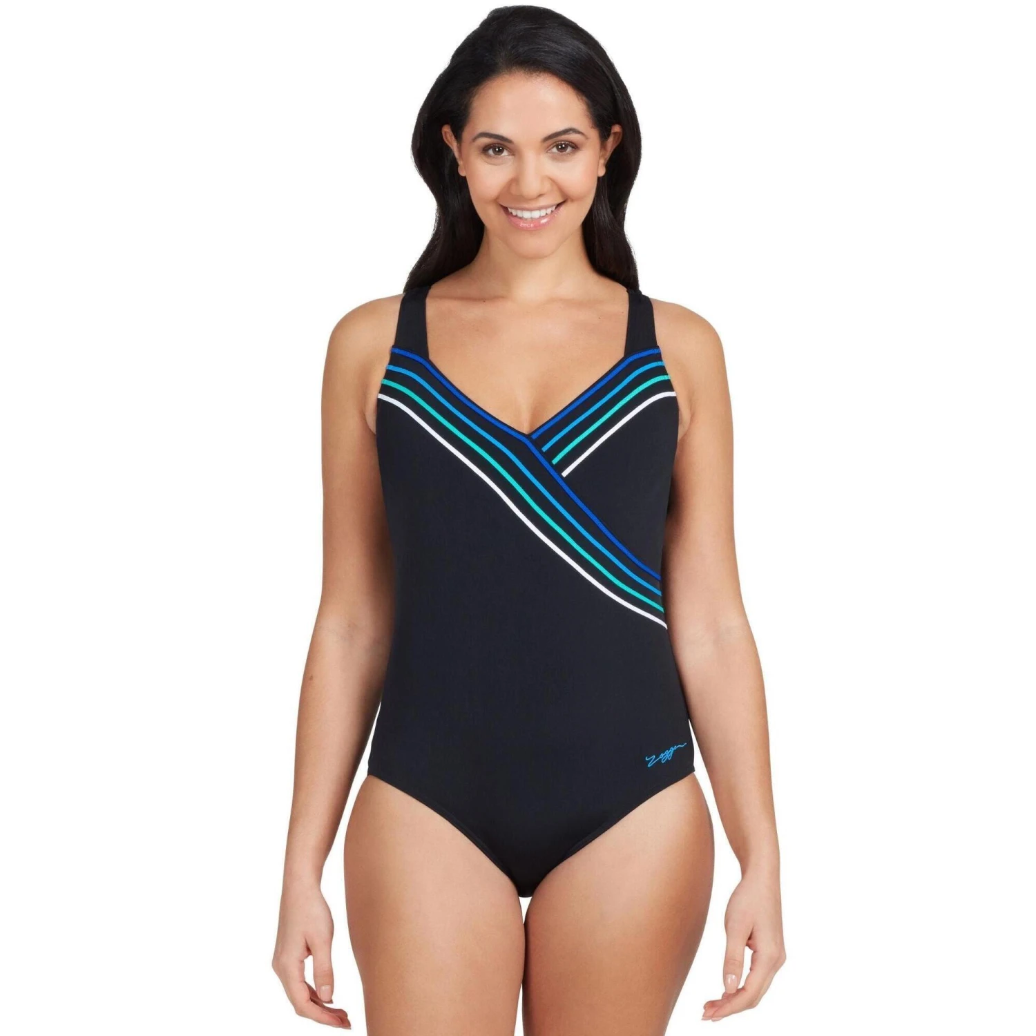 FEATURES Concealed underwire Shelf bra for added support Supportive wide straps Medium leg height 100% chlorine-resistant quick-drying fabric with UPF50+ sun protection Made with Ecolast+â„¢ fabric that features REPREVE® yarn made from recycled post-consumer plastic bottles to help protect our environment for future generations and it’s 100% chlorine-proof. 4X greater fabric compression than traditional generic swimwear fabrics 55% Recycled Polyester 45% Polyester P.B.T This stunning navy swimsuit from Zoggs features flattering diagonal stripes and a high scoopback with the addition of underwiring and wide straps for maximum support in the pool. This swimsuit is chlorine resistant ensuring a long-lasting fit and to stay safe in the sun offers UPF50+ sun protection.